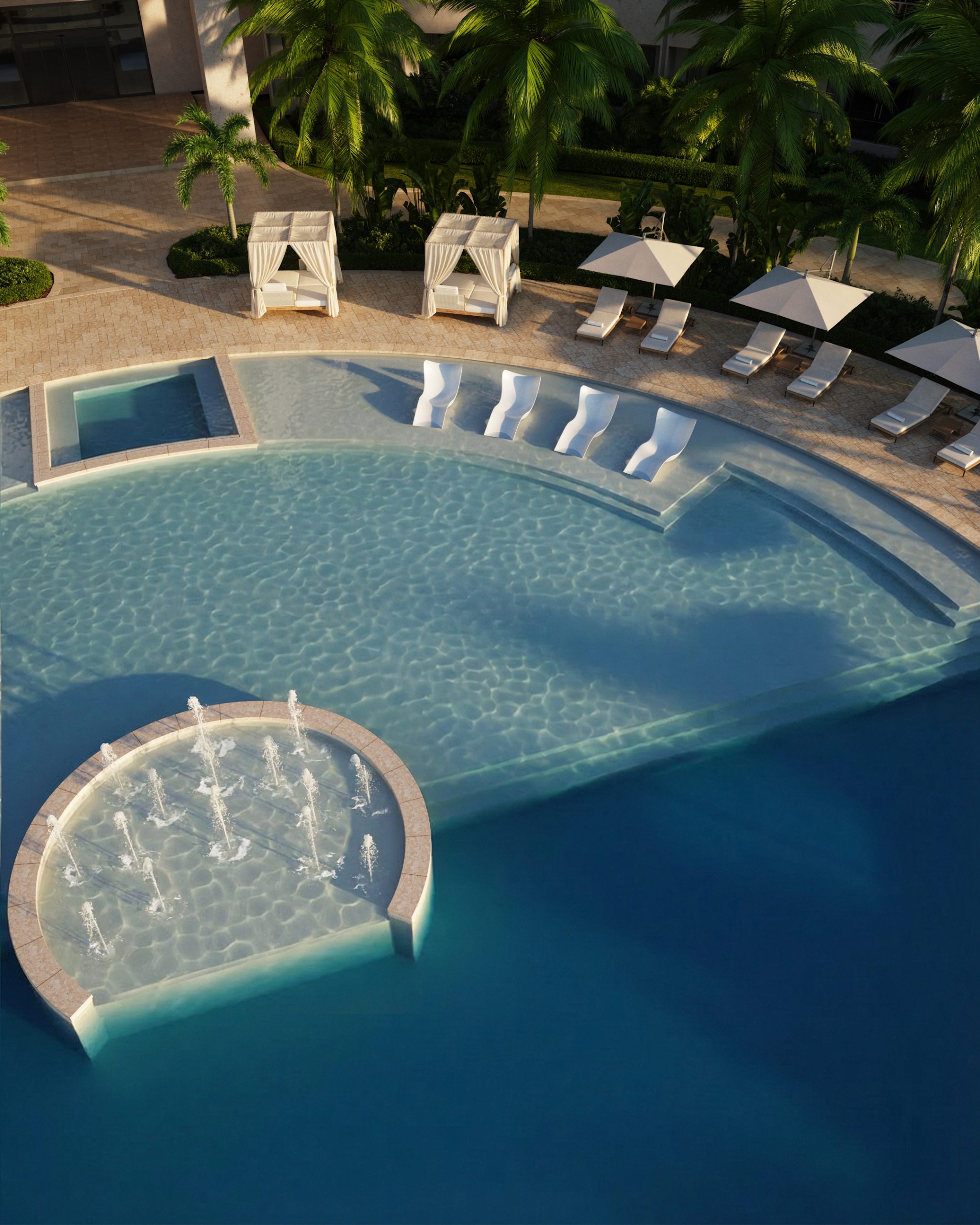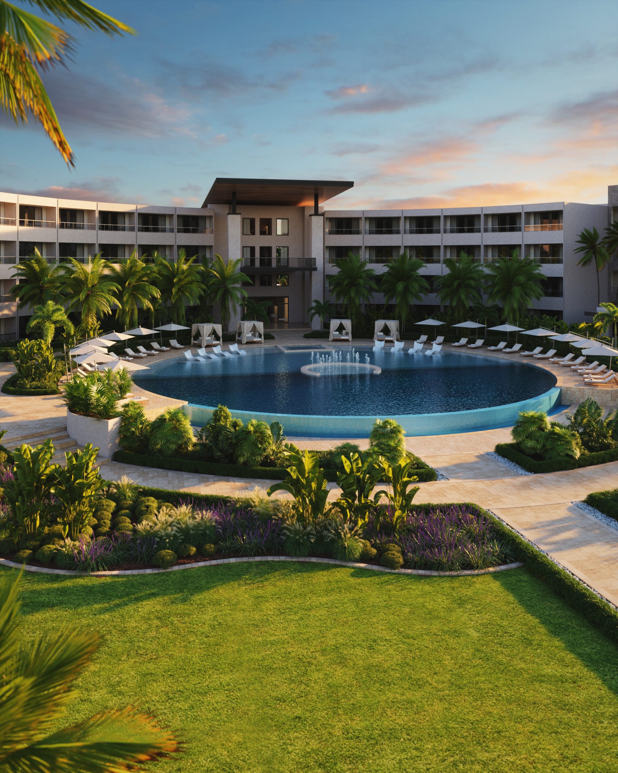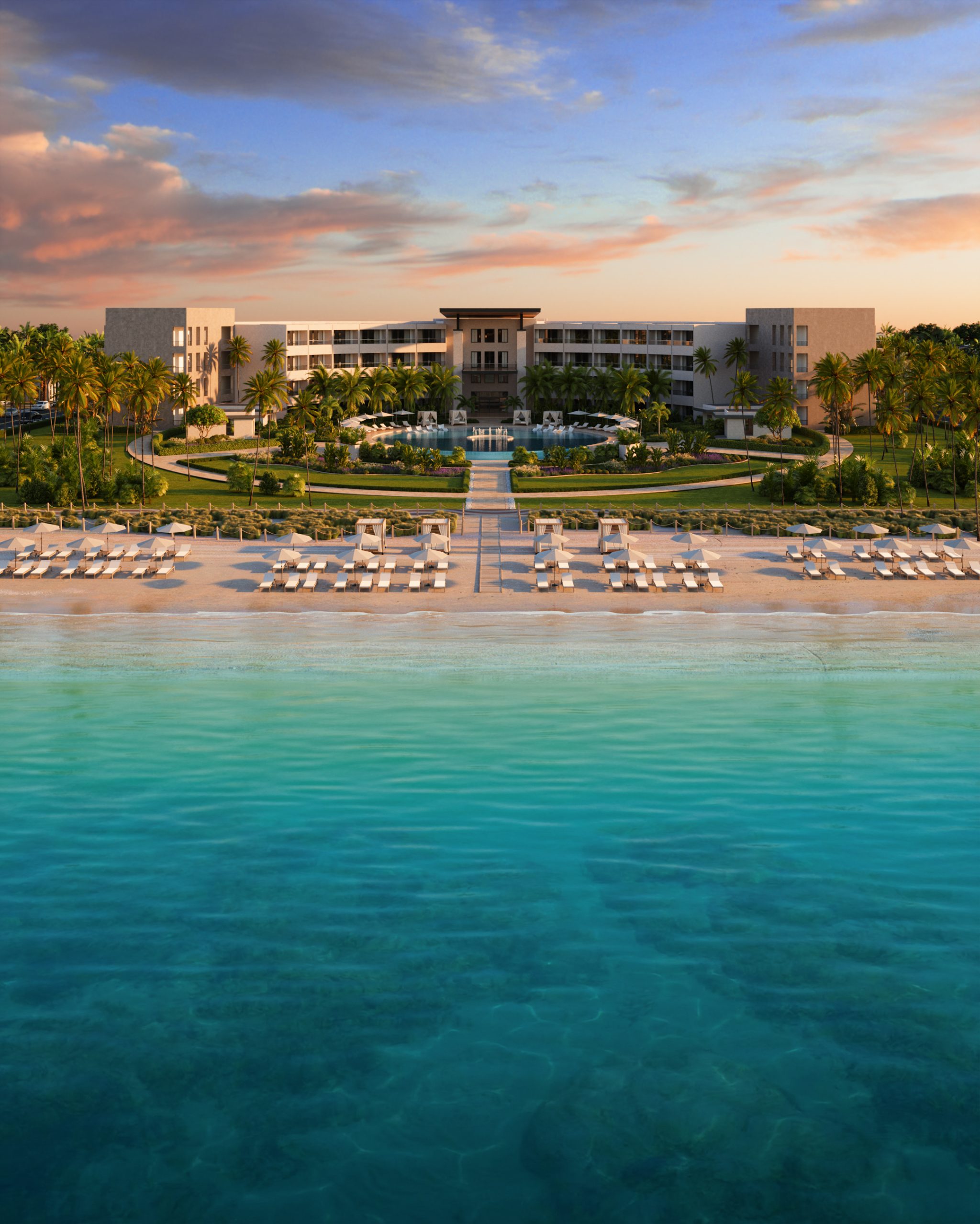 Scope: Full exterior visualization, resort masterplan views, pool and amenity environments, beachfront integration, selected guest perspectives